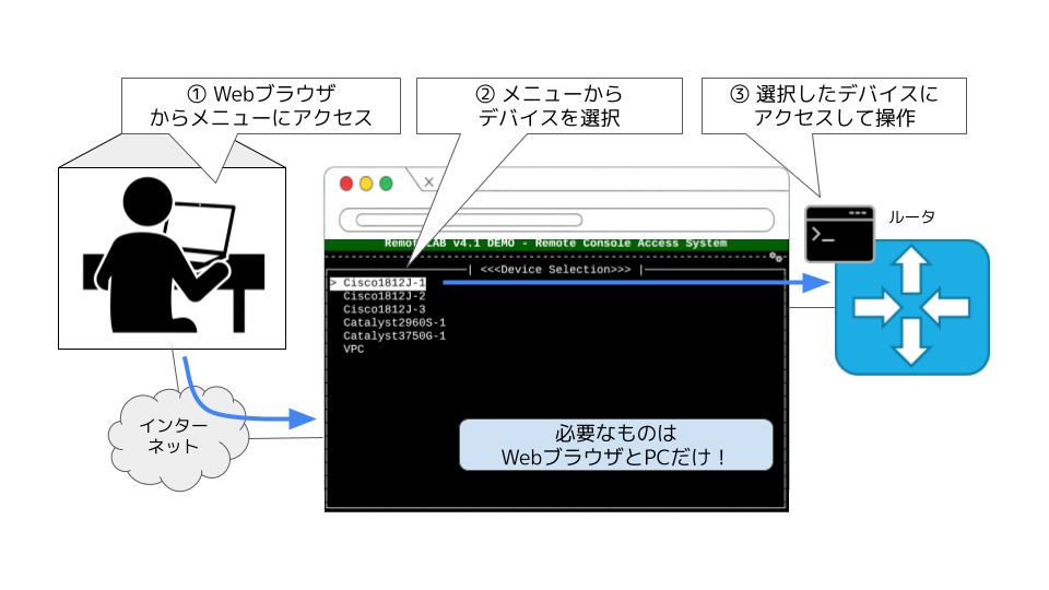このシステムでは、Webブラウザのみで実際の環境にアクセスし、実機を操作することができます。